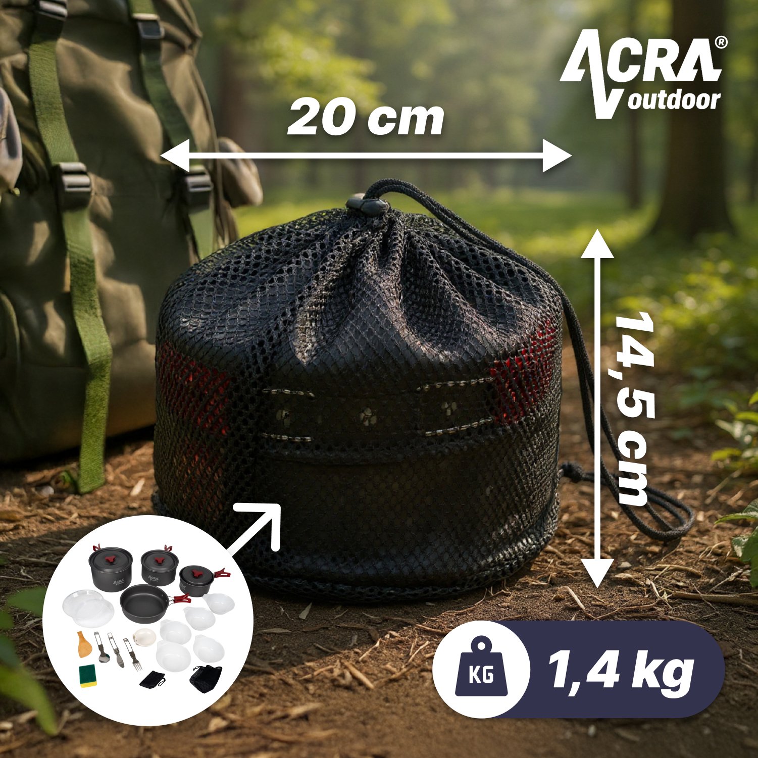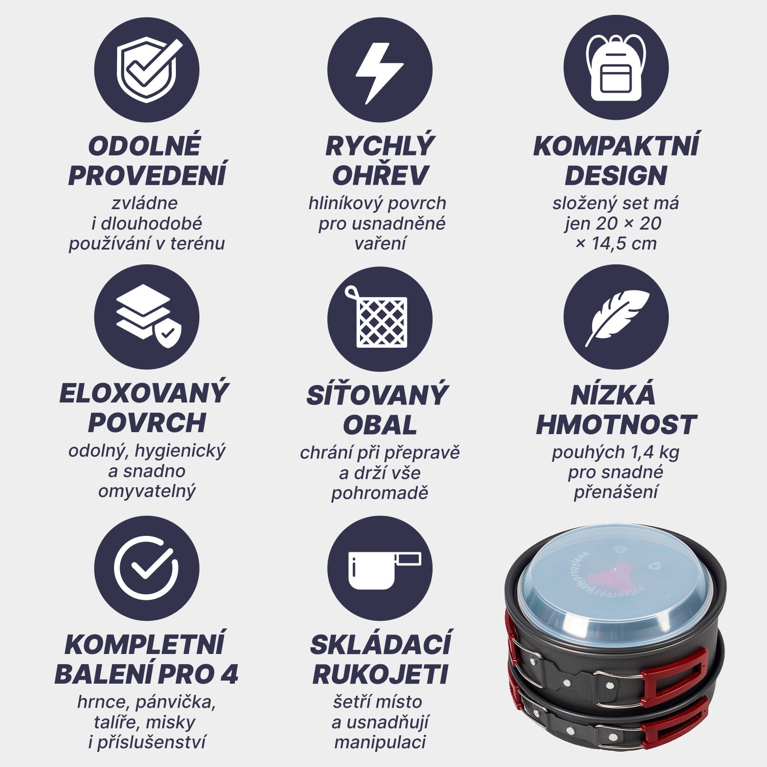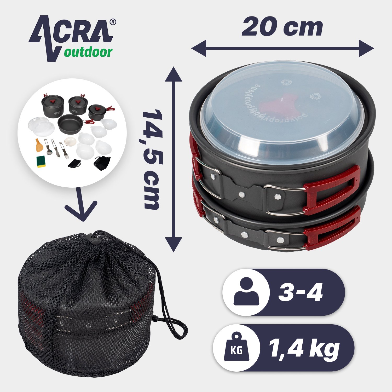 Ultralight sada riadu Acra C22:Varenie na cestách pre celú rodinu! Hľadáte praktickú a kompaktnú sadu riadu, ktorá vám uľahčí varenie na vašich turistických a kempingových výletoch s rodinou? Potom je Ultralight súprava riadu Acra C22 od spoločnosti Acra Sport ideálnou voľbou! Súprava obsahuje všetko potrebné na prípravu jedál až pre 4 osoby a je vyrobená z odolných a ľahkých materiálov, ktoré uľahčujú jej prenášanie. Hlavné vlastnosti: Kompaktný a skladný dizajn. Praktická sklopná rukoväť: Kastróly a misy majú sklopnú rukoväť, ktorá šetrí miesto a umožňuje pohodlnú manipuláciu. Rýchly ohrev potravín: Hliníkový povrch riadu zabezpečuje rýchly a rovnomerný ohrev potravín. Odolné materiály: Súprava je vyrobená z odolnej hliníkovej zliatiny a plastu, takže vydrží aj náročné vonkajšie podmienky. Tvrdý eloxovaný povlak - odolný a ľahko sa čistí Obsah súpravy:1x kastról 2 l1x kastról 1,3 l1x kastról 0,7 l1x panvica 0, Hmotnosť: 1,4 kg Ultralahká súprava riadu Acra C22 je ideálna pre tých, ktorí oceňujú praktickosť, nízku hmotnosť a odolnosť. Je ideálna na turistiku, kempovanie, piknik a iné outdoorové aktivity s rodinou. Tip.