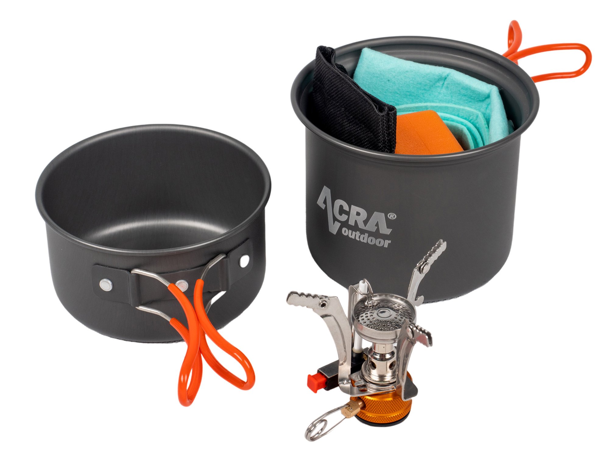 Ultralight súprava riadu Acra C23: kempingová súprava s plynovým varičom.