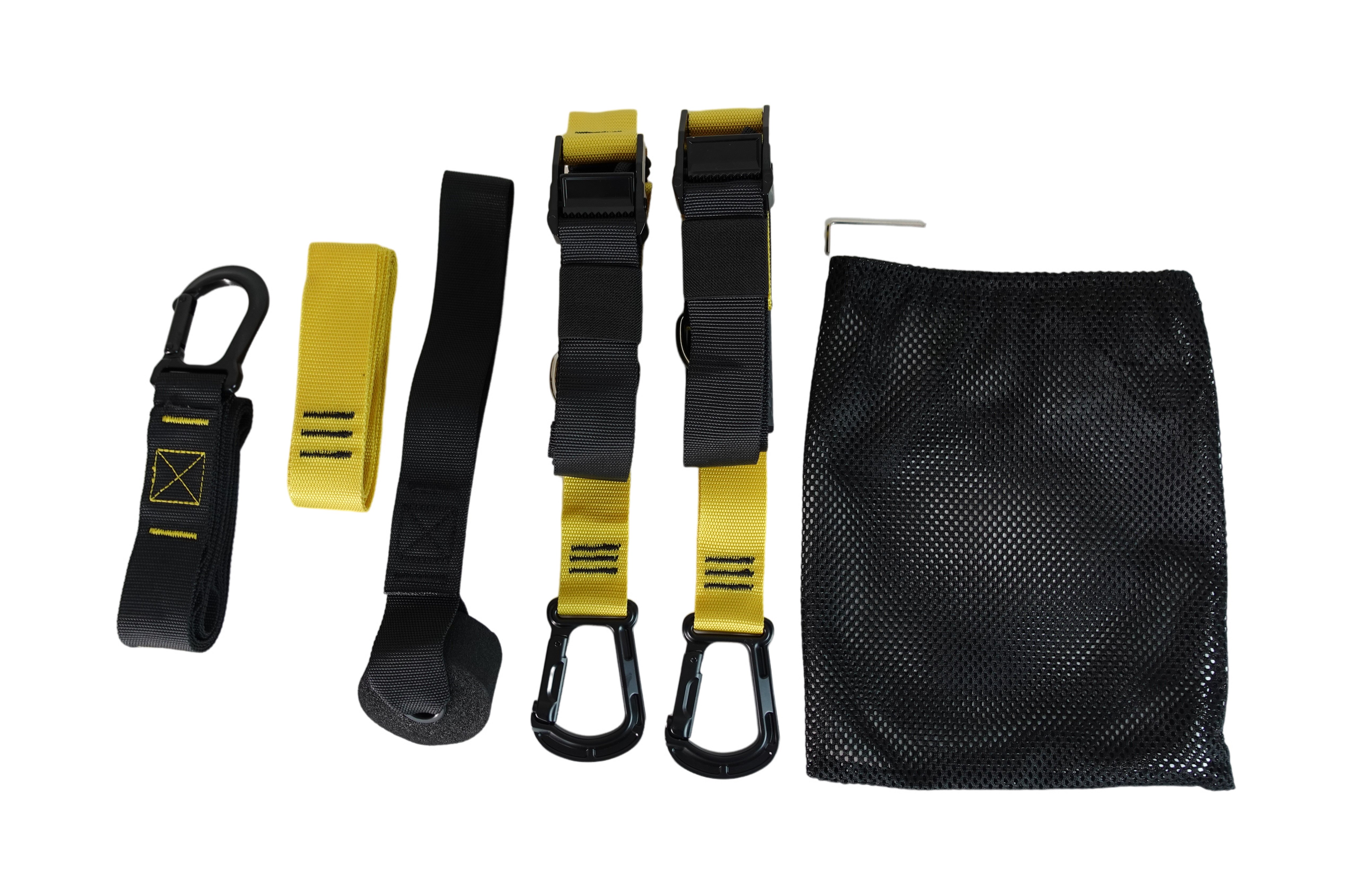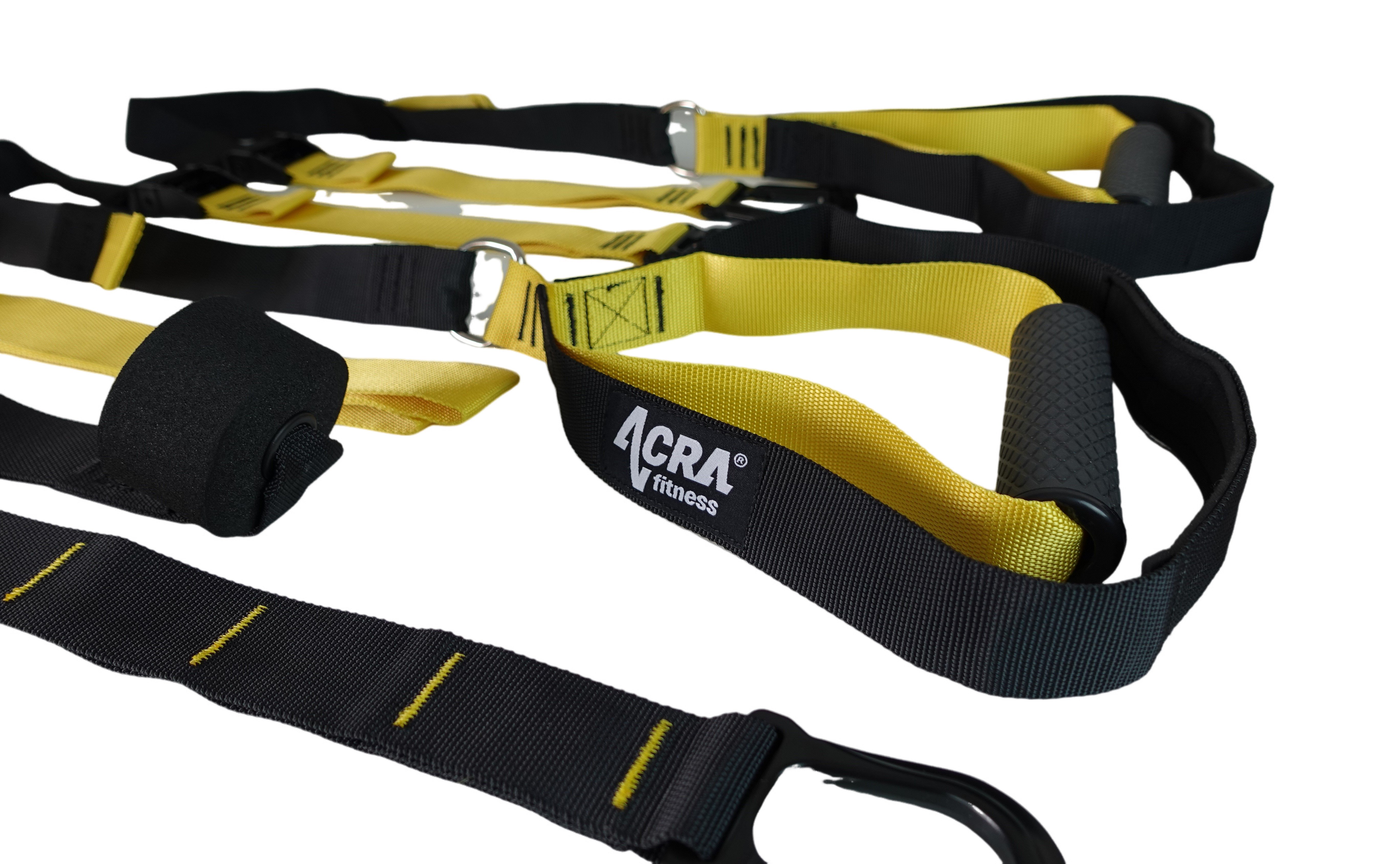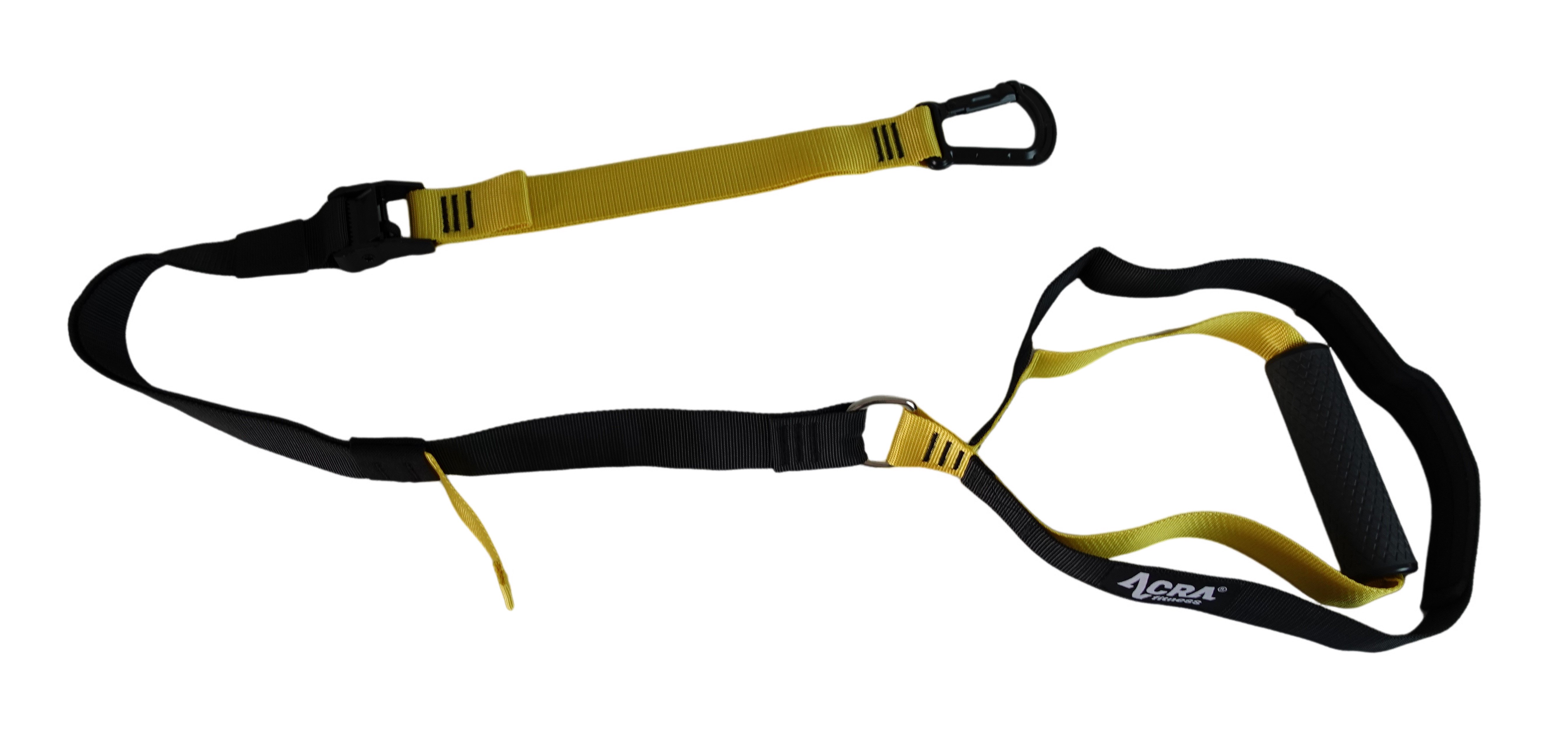 Dva pevné popruhy s nastaviteľnou dĺžkou: Tieto popruhy sú zakončené gumenými (TPR) rukoväťami, ktoré možno použiť na ruky aj nohy. Popruhy možno podľa potreby používať samostatne.